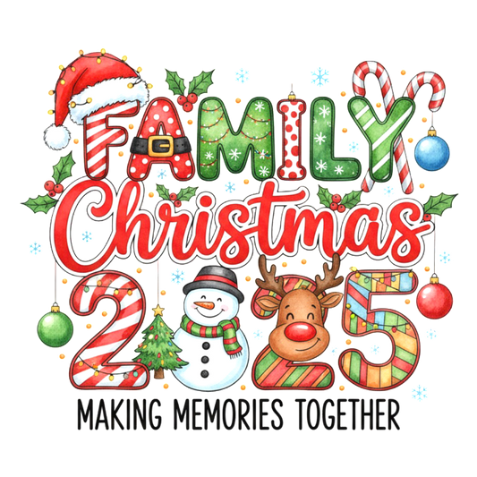 Colorful "Family Christmas 2025" design featuring festive characters and cheerful decorations.DTF Transfers