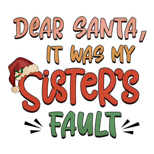 A playful holiday design featuring the phrase "Dear Santa, it was my sister's fault," adorned with a festive Santa hat. dtf prints