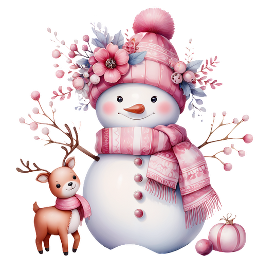 A cheerful pink-hatted snowman adorned with flowers and a matching scarf, accompanied by a cute reindeer and festive decorations. heat press transfers