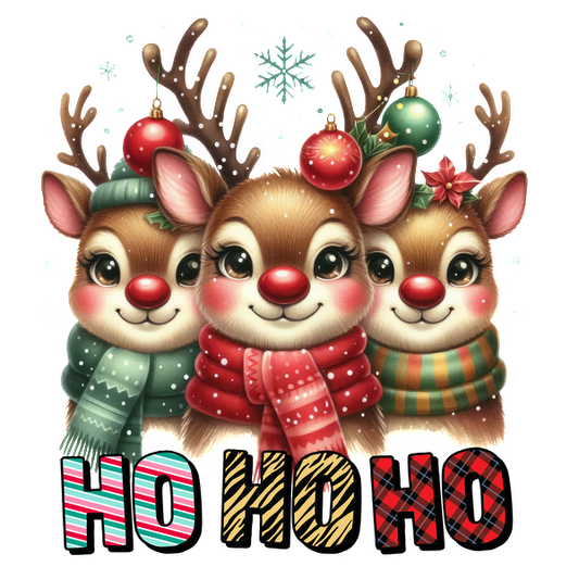 Adorable festive reindeer wearing colorful scarves and holiday decorations, joyfully exclaiming "HO HO HO" against a snowy backdrop. dtf prints
