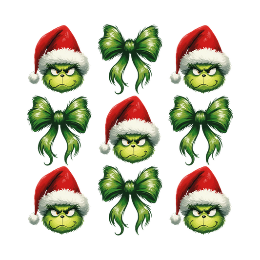 A playful festive pattern featuring Grinch faces in Santa hats and vibrant green bows, perfect for holiday designs. heat press transfers