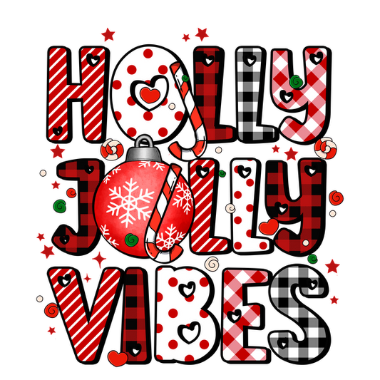 Cheerful and festive "Holly Jolly Vibes" graphic featuring playful typography, colorful ornaments, and a holiday spirit theme.dtf regular iron