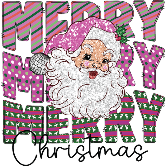 A festive graphic featuring a cheerful Santa Claus surrounded by colorful "MERRY" text, perfect for celebrating Christmas.dtf regular iron
