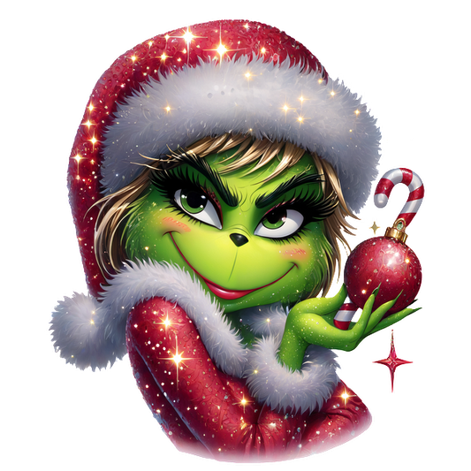 A playful, festive Grinch character in a sparkling red Santa outfit, holding a shiny ornament and a candy cane.DTF Transfersdtf regular iron