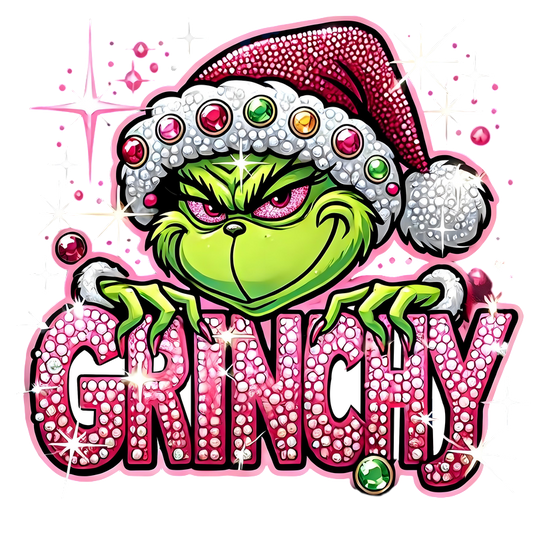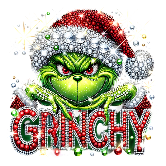 A sparkling, festive illustration of the Grinch features vibrant colors, holiday attire, and bold "GRINCHY" lettering adorned with jewels.DTF Transfers heat press transfers