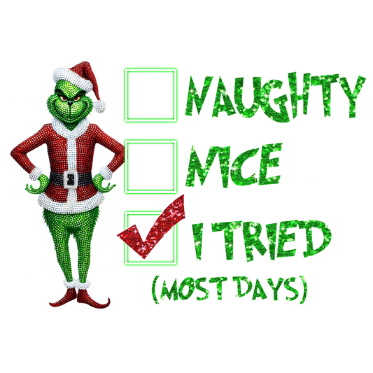 A whimsical Grinch design with checkboxes for "Naughty," "Nice," and an checkmark for "I Tried (Most Days)" adds festive fun.DTF Transfersdtf regular iron