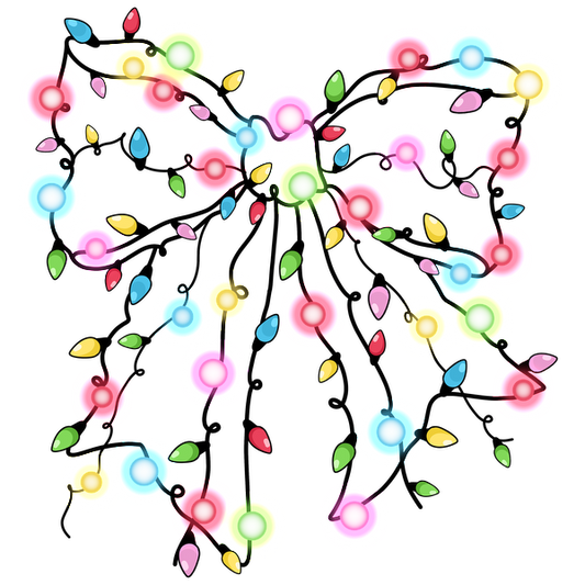 Regular price From £0.75 GBPRegular priceUnit price / per£2.40 GBPSale price From £0.75 GBPA festive, vibrant Christmas bow adorned with colorful lights and holly accents, perfect for holiday decorations. heat press transfers