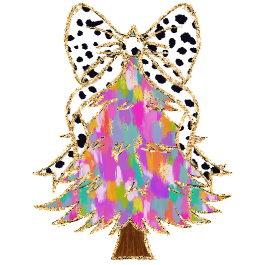 A vibrant, colorful Christmas tree illustration adorned with a stylish black and white polka dot bow, featuring golden accents. dtf transfers