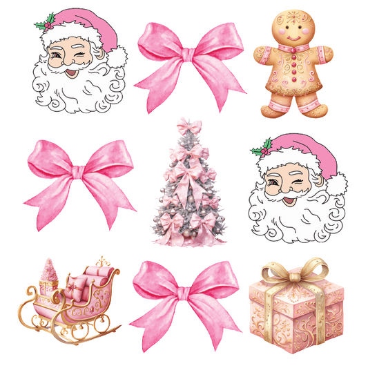A festive collage featuring cute Santa illustrations, pink bows, a gingerbread man, a decorated Christmas tree, a sleigh, and a gift box. heat press transfers