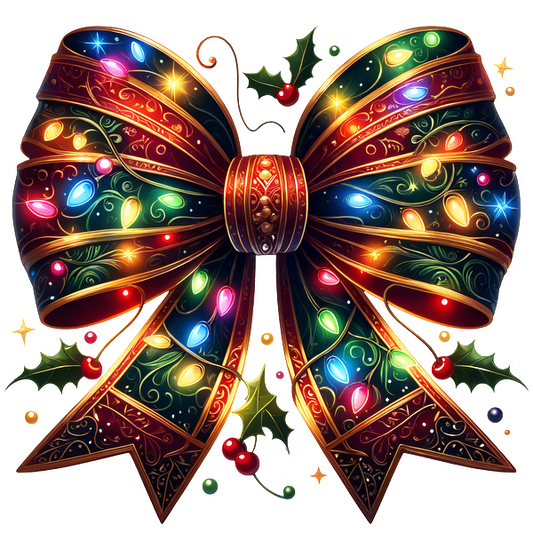 A festive, vibrant Christmas bow adorned with colorful lights and holly accents, perfect for holiday decorations. heat press transfers
