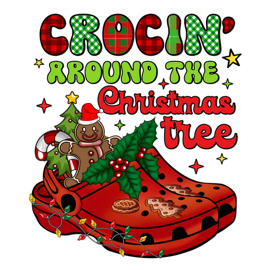 Celebrate the holidays in style with this fun festive design featuring whimsical Crocs, a gingerbread man, and cheerful Christmas decorations. heat press transfers