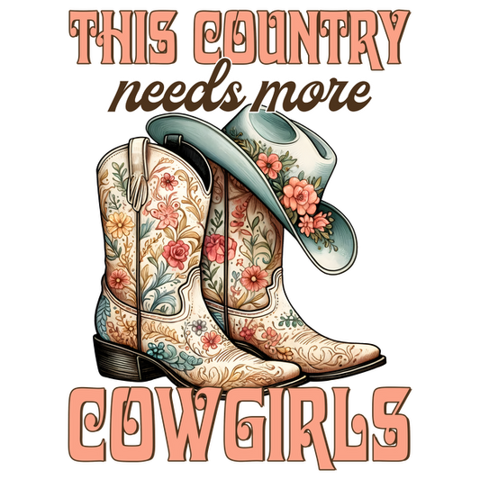 "Stylish cowboy boots adorned with floral patterns, paired with a trendy cowboy hat, promoting the spirit of cowgirls."dtf regular iron