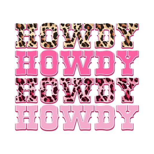 A fun and vibrant design featuring the word "Howdy" in various animal print and pink styles, perfect for expressive greetings! dtf prints