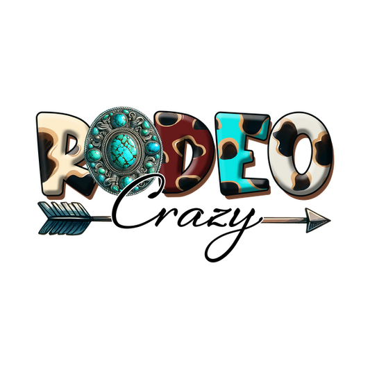A vibrant "Rodeo Crazy" logo featuring playful lettering with turquoise accents and a rustic arrow, embodying a fun western spirit. dtf transfers