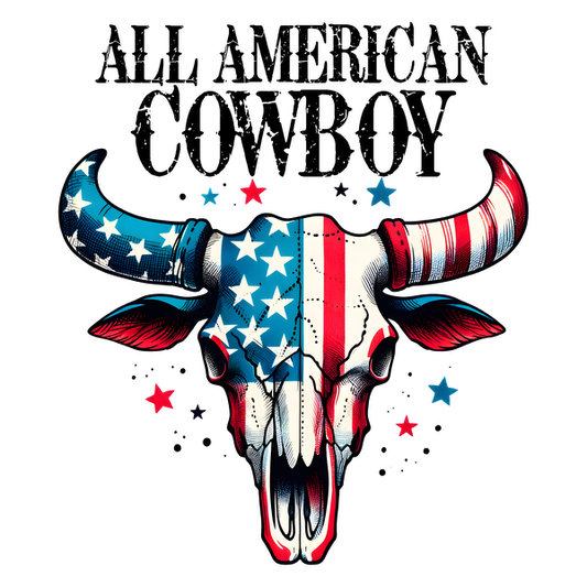 A vibrant illustration of a bull skull adorned with the American flag, surrounded by colorful stars. dtf transfers