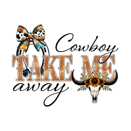 Whimsical cowboy-themed design featuring the phrase "Take Me Away," accented with a horseshoe, colorful bow, and floral skull.