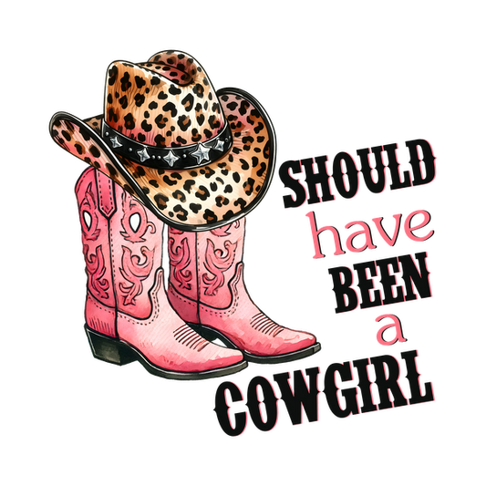 Regular price From £0.75 GBPRegular priceUnit price / per£2.40 GBPSale price From £0.75 GBPA vibrant illustration featuring pink cowboy boots and a stylish leopard-print hat, with the phrase "Should have been a Cowgirl." dtf transfers