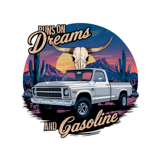 A vintage white pickup truck stands against a vibrant desert backdrop, featuring a bold "Runs on Dreams and Gasoline" quote. heat press transfers