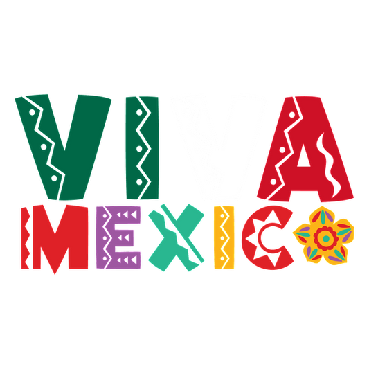 Bold and colorful "Viva Mexico" lettering with playful patterns and a decorative flower, celebrating Mexican culture and heritage. heat press transfers