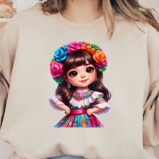 A cheerful girl in a colorful traditional dress adorned with vibrant floral patterns, wearing a floral crown and cheerful accessories. dtf prints