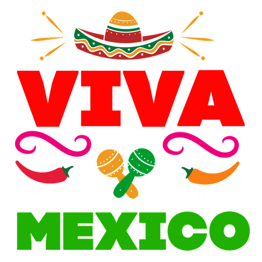 Celebrate Mexican culture with this vibrant design featuring "Viva Mexico," colorful maracas, a sombrero, and decorative chili peppers. dtf transfers