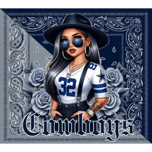 Regular price From £0.75 GBPRegular priceUnit price / per£2.40 GBPSale price From £0.75 GBPA stylish illustration of a woman rocking a Cowboys jersey, hat, and sunglasses against a floral patterned background. dtf prints