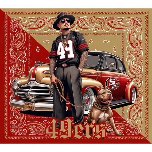 Regular price From £0.75 GBPRegular priceUnit price / per£2.40 GBPSale price From £0.75 GBPA stylish figure in a 49ers jersey stands beside a vintage car, holding a leash attached to a pit bull. dtf prints