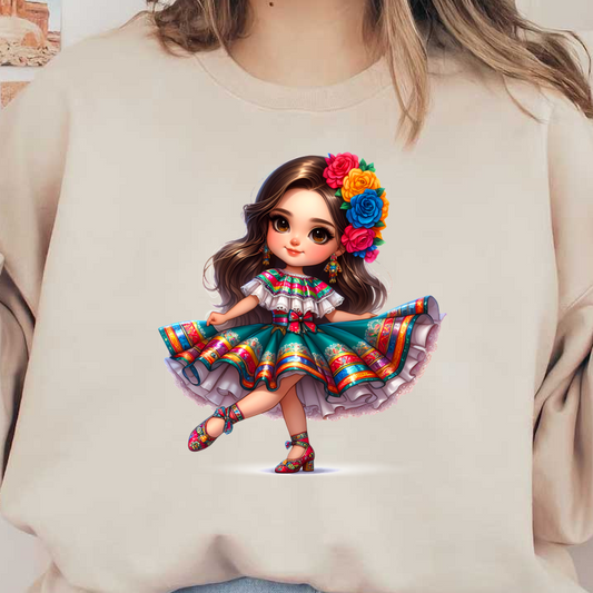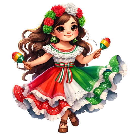 A cute cartoon girl with long, curly hair wearing a traditional Mexican dress featuring green, white, and red colors and a big bow. heat press transfers