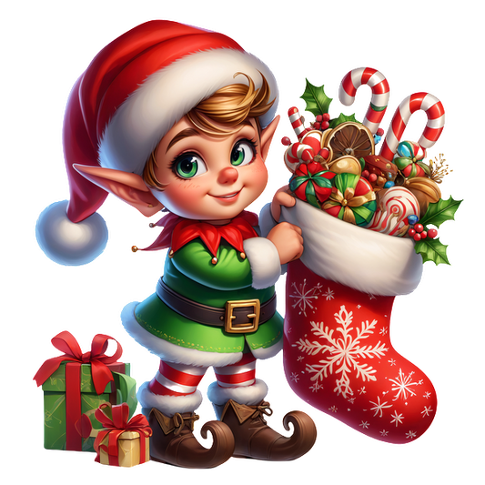 Regular price From £0.75 GBPRegular priceUnit price / per£2.40 GBPSale price From £0.75 GBPA cheerful elf in a festive outfit holds a colorful Christmas stocking filled with sweets, surrounded by holiday gifts.DTF Transfers dtf prints