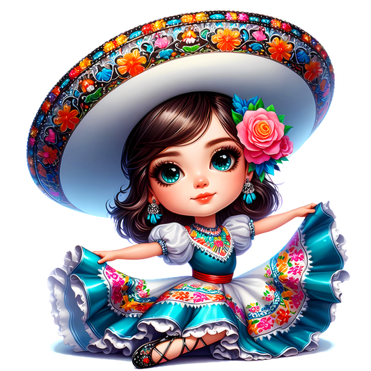 Regular price From £0.75 GBPRegular priceUnit price / per£2.40 GBPSale price From £0.75 GBPA cute cartoon girl with long, curly hair wearing a traditional Mexican dress featuring green, white, and red colors and a big bow. heat press transfers
