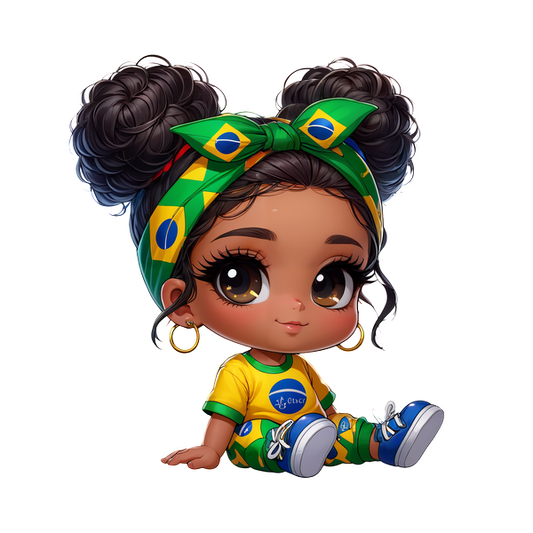 A cute character with curly hair, wearing a bright yellow and green outfit and a matching headband, celebrating Brazilian culture.DTF Transfersdtf regular iron