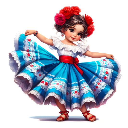Regular price From £0.75 GBPRegular priceUnit price / per£2.40 GBPSale price From £0.75 GBPA joyful girl in a vibrant blue dress adorned with lace and floral patterns, complemented by a red sash and flowers in her hair. heat press transfers