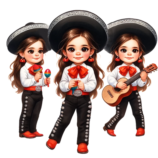 Regular price From £0.75 GBPRegular priceUnit price / per£2.40 GBPSale price From £0.75 GBPA charming trio of cute children dressed in traditional mariachi attire, showcasing playful instruments and colorful accessories. heat press transfers