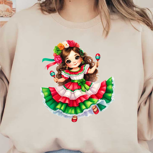A charming girl in a colorful traditional dress, adorned with flowers and holding maracas, embodies festive spirit and culture. dtf transfers
