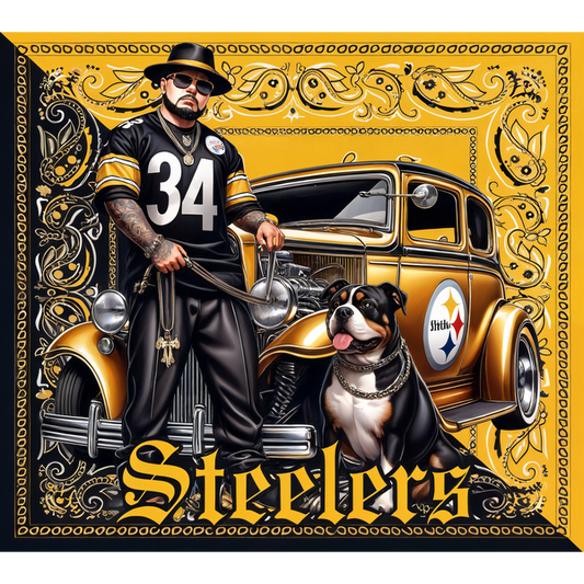 Regular price From £0.75 GBPRegular priceUnit price / per£2.40 GBPSale price From £0.75 GBPA stylish illustration featuring a man in a Steelers jersey beside a smiling dog in front of a vintage car. heat press transfers