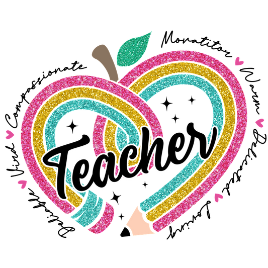 A vibrant, glittery design featuring colorful pencils forming a heart shape with the word "Teacher" prominently displayed, perfect for educators.DTF Transfers