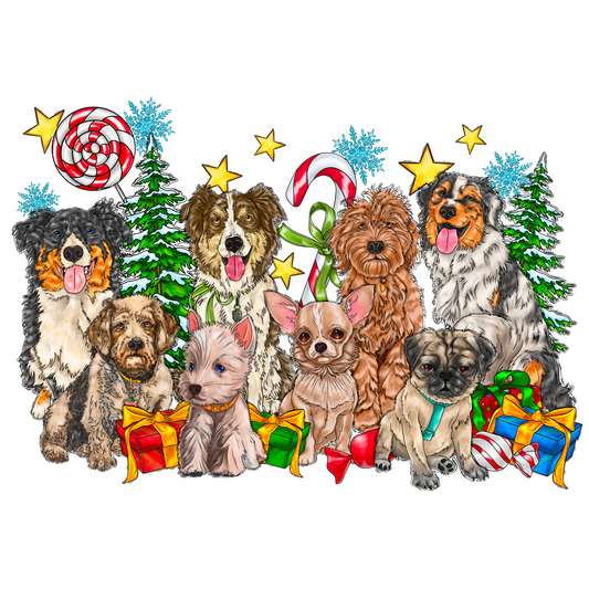 A cheerful illustration of various adorable dogs surrounded by Christmas decorations, including trees, candy canes, and colorful gifts.DTF Transfersdtf regular iron heat press transfers