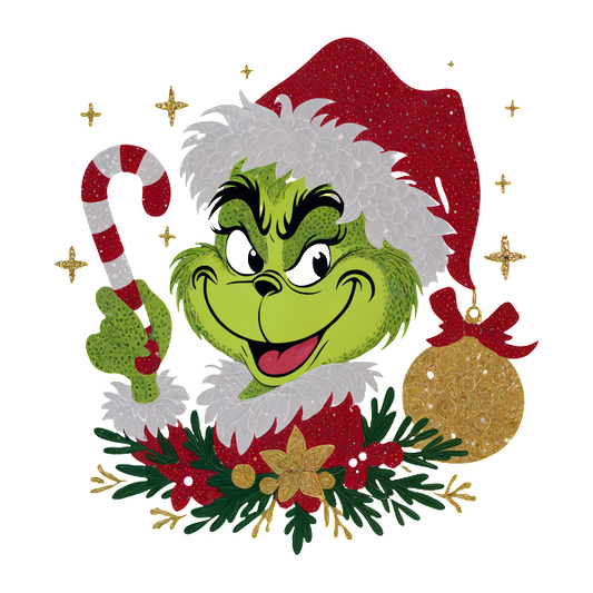 This festive design features the Grinch in a red Santa hat, holding a candy cane amidst Christmas decorations and greenery.DTF Transfers