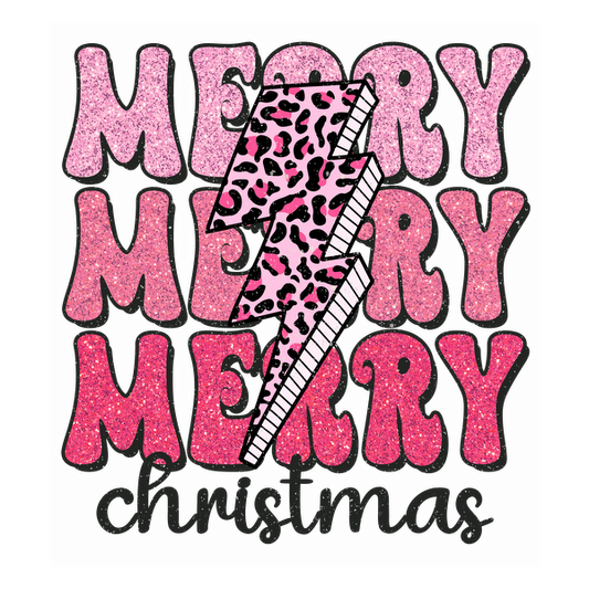Festive "Merry Christmas" design featuring bold glittery text and a stylish pink leopard print lightning bolt. heat press transfers