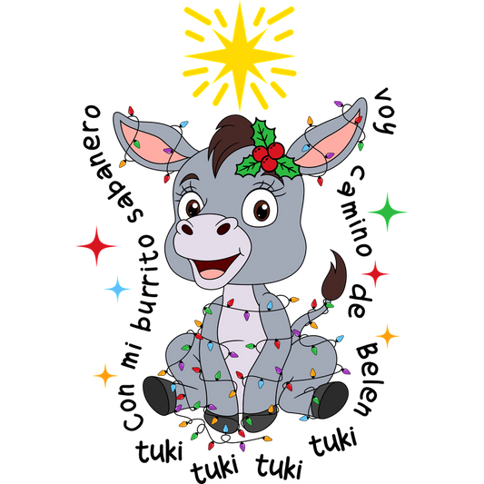 A cheerful cartoon donkey adorned with festive lights and a holly leaf, radiating holiday joy under a bright star.DTF Transfers dtf prints