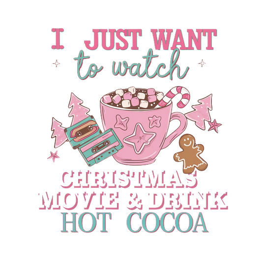 Cozy holiday design featuring a whimsical mug of hot cocoa, Christmas movies, and festive elements like gingerbread and candy canes.dtf regular iron