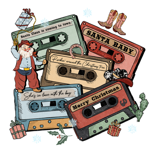 A festive design featuring colorful cassette tapes with Christmas song titles and a cheerful Santa, perfect for holiday charm. dtf prints