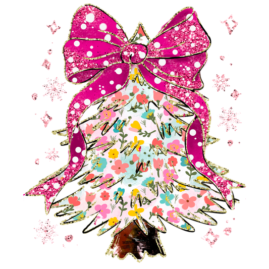 Festively adorned with a sparkling pink bow and floral patterns, this whimsical Christmas tree adds a cheerful touch to holiday decor.DTF Transfers dtf prints