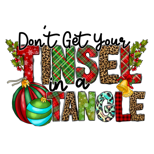 A festive and playful graphic featuring the phrase "Don't Get Your Tinsel in a Tangle," adorned with Christmas ornaments and holly.DTF Transfers heat press transfers heat press transfers