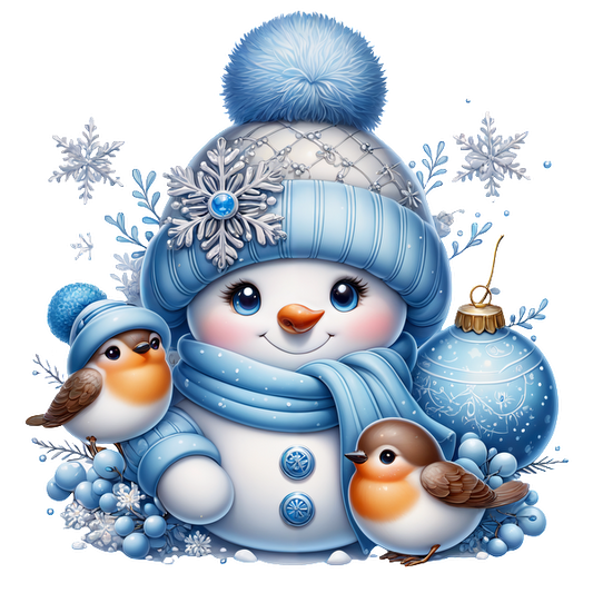 A cheerful snowman dressed in cozy blue attire, surrounded by two birds and festive decorations, radiates winter charm.DTF Transfersdtf regular iron