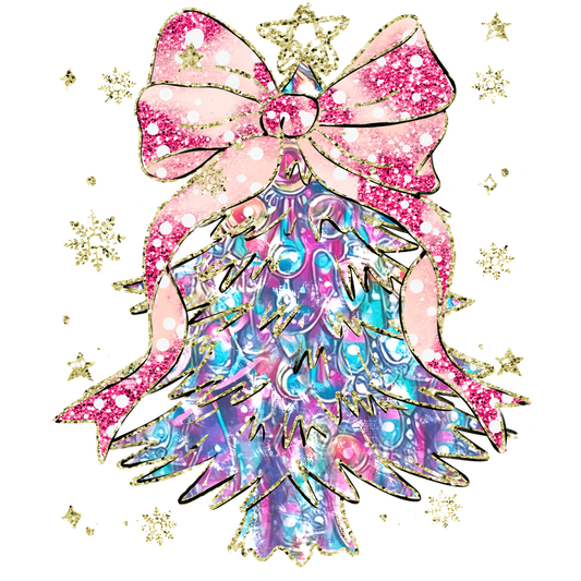 A colorful, glittery Christmas tree adorned with a pink bow, surrounded by whimsical snowflakes for a festive touch.DTF Transfersdtf regular iron