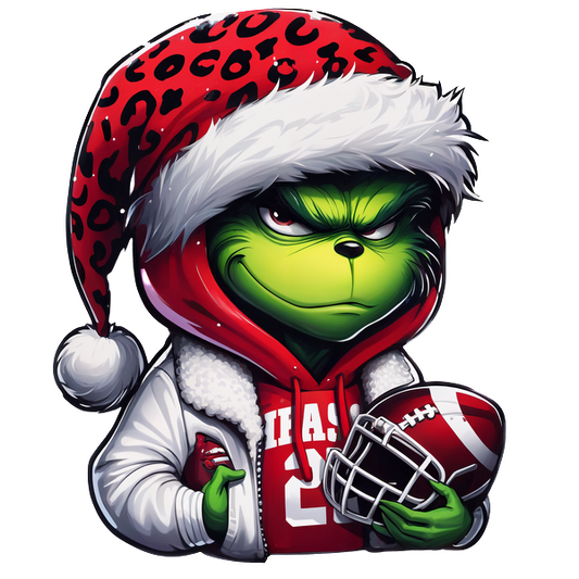 A playful Grinch character in a red and white Santa hat, wearing a sporty jacket and holding a football.DTF Transfers dtf transfers