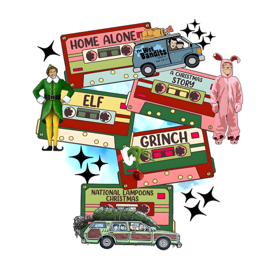 Celebrate the holiday spirit with iconic movie-themed cassette tapes featuring characters from beloved films like "Home Alone," "Elf," and "The Grinch."DTF Transfersdtf regular irondtf regular iron