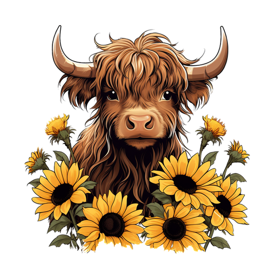 A charming Highland cow surrounded by vibrant sunflowers, featuring a fluffy mane and expressive eyes, adding a rustic touch. dtf prints