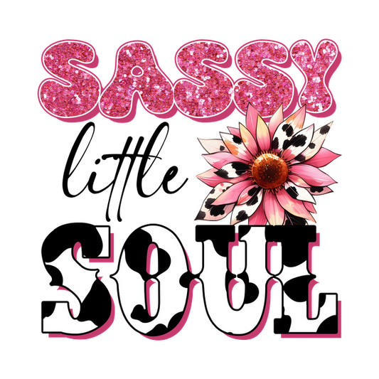 A vibrant and playful design featuring the words "Sassy Soul" with sparkly lettering and a colorful flower motif. dtf transfers dtf transfers